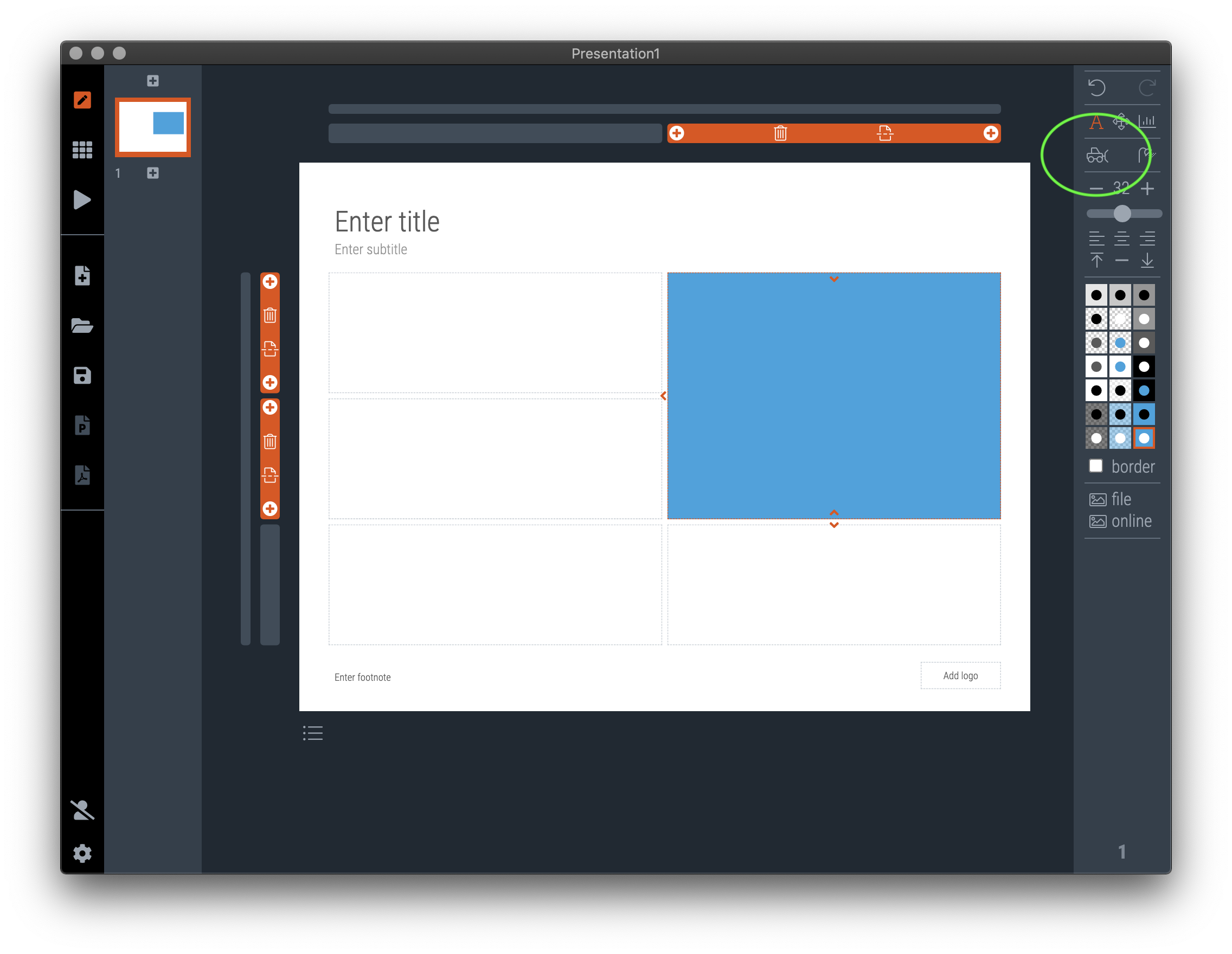 When you click a box in edit mode, you can change its appearance: font size, colours, alignment, etc. SlideMagic only uses one accent colour to keep your presentation consistent.